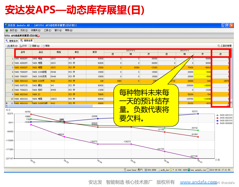 APS生产排程通过排程计划拉动物料需求计划,产出机台产线即时物料需求、生产单每日物料需求及物料每日动态库存展望,结合客户交货需求、库存、生产计划、用料计划、供应商交货计划等,自动灵活计算出未来每天每种物料的动态库存,防止物料供应不及时,库存呆滞一大堆,造成生产缺料、产能浪费情况的产生。