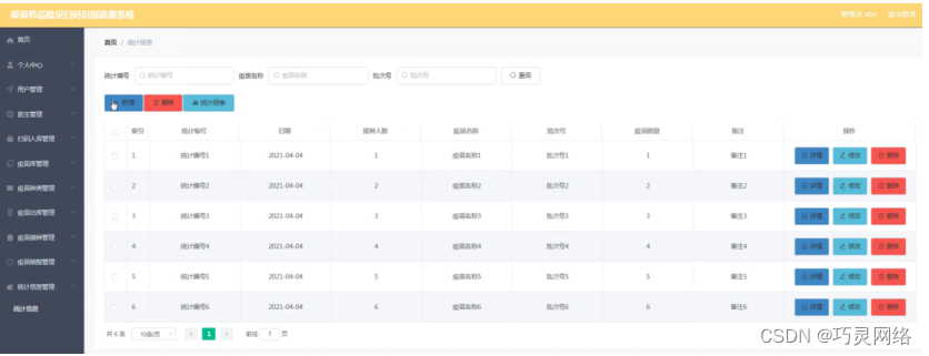 统计信息管理,在统计信息管理页面中可以对索引、统计编号、日期、接种人数、疫苗名称、批次号、疫苗数量、备注等信息进行详情,修改或删除等操作,如图5-10所示。