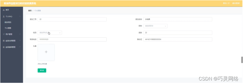 个人中心,在个人中心页面中可以填写医生工号、医生姓名、职称、性别、医龄、联系电话、身份证、头像等信息进行修改操作,如图5-12所示。