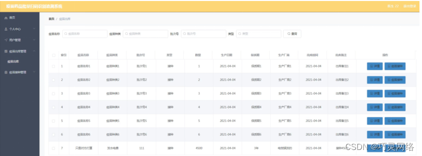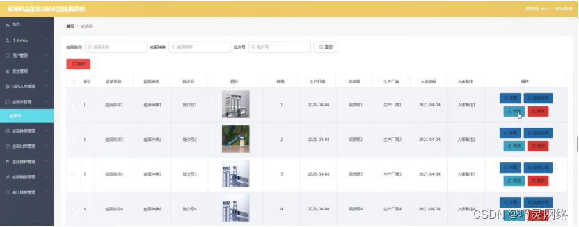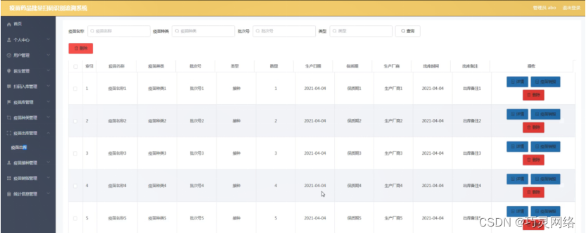 疫苗库管理,在疫苗库管理页面中可以对索引、疫苗名称、疫苗种类、批次号、图片、数量、生产日期、保质期、生产厂商、入库时间、入库备注等信息进行详情、疫苗出库、修改或删除等操作,如图5-6所示。