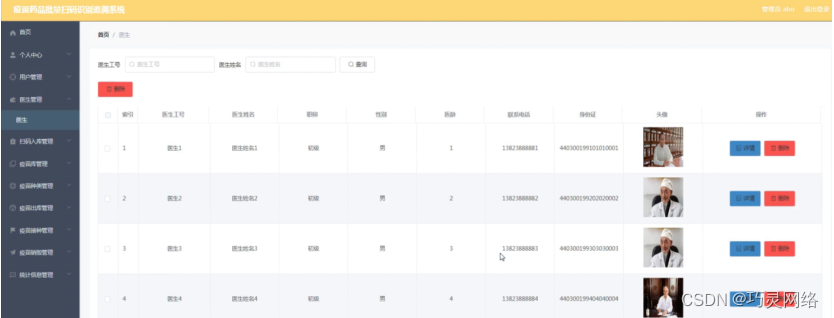 医生管理,在医生管理页面中可以对索引、医生工号、医生姓名、职称、性别、医龄、联系电话、身份证、头像等信息进行详情或删除等操作,如图5-4所示。