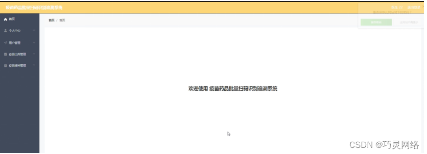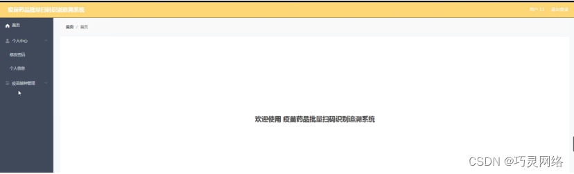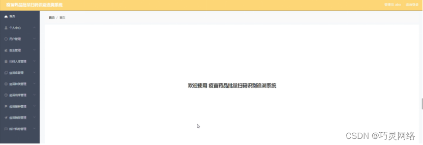 管理员登录进入疫苗药品批量扫码识别追溯系统可以查看首页、个人中心、用户管理、 医生管理、扫码入库管理、疫苗库管理、疫苗种类管理、疫苗出库管理、疫苗接种管理、疫苗销毁管理、统计信息管理等信息进行详细操作,如图5-2所示。