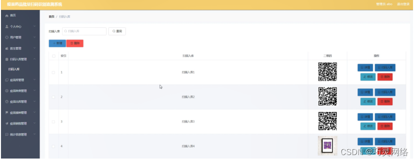 扫码入库管理,在扫码入库管理页面中可以对索引、扫描入库、二维码等信息进行详情、扫码入库、修改或删除等操作,如图5-5所示。