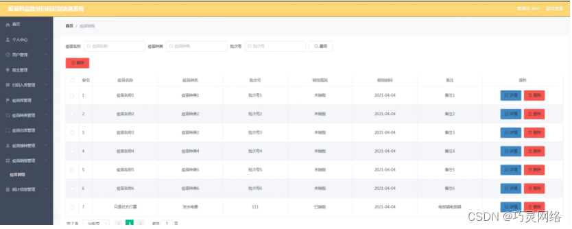 疫苗出库管理,在疫苗出库管理页面中可以对索引、疫苗名称、疫苗种类、批次号、类型、数量、生产日期、保质期、生产厂商、出库时间、出库备注等信息进行详情、疫苗销毁或删除等操作,如图5-7所示。