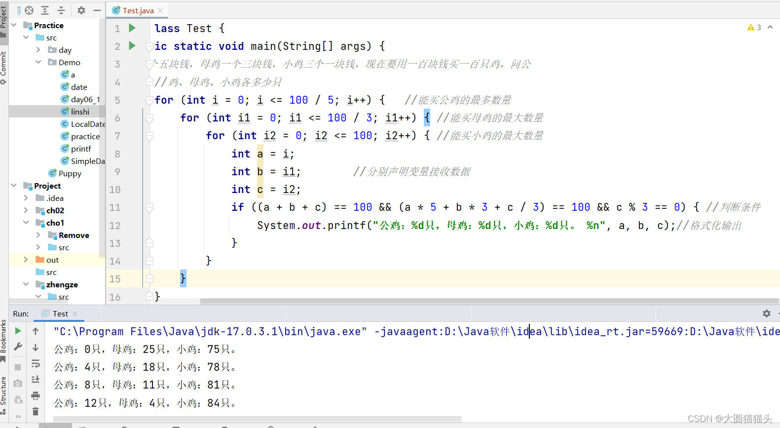 //公鸡一个五块钱,母鸡一个三块钱,小鸡三个一块钱,现在要用一百块钱买一百只鸡,问公//鸡、母鸡、小鸡各多少只for (int i = 0; i <= 100 / 5; i++) { //能买公鸡的最多数量for (int i1 = 0; i1 <= 100 / 3; i1++) { //能买母鸡的最大数量for (int i2 = 0; i2 <= 100; i2++) { //能买小鸡的最大数量int a = i;int b = i1; //分别声明变量接收数据int c = i2;if ((a + b + c) == 100 && (a * 5 + b * 3 + c / 3) == 100 && c % 3 == 0) { //判断条件System.out.printf("公鸡:%d只,母鸡:%d只,小鸡:%d只。 %n", a, b, c);//格式化输出}}}}}