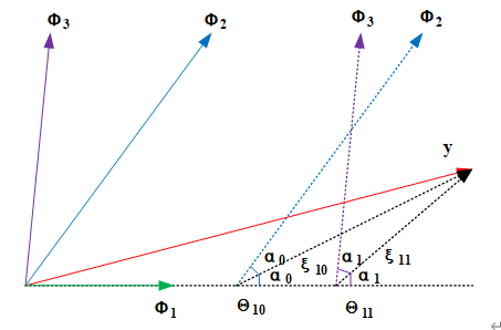 图中三个特征向量 Φ 1 \Phi_1 Φ1 , Φ 2 \Phi_2 Φ2, Φ 3 \Phi_3 Φ3(特征向量可能是由以系统输入输出和固定的非线性参数为自变量的非线性函数构成的复杂向量)和一个系统输出向量 y y y均由实线画出。在第一步中,由于相较 Φ 2 \Phi_2 Φ2、 Φ 3 \Phi_3 Φ3, Φ 1 \Phi_1 Φ1与最初的残差即系统响应 y y y的相关度最高,因而被选为第一个回归变量。接着选择第二个回归变量,先选择合适的回归系数 Θ 10 \Theta_{10} Θ10,使得 Φ 1 \Phi_1 Φ1和 Φ 2 \Phi_2 Φ2分别与残差 ∣ y − Θ 10 Φ 1 ∣ = ξ 10 \vert y-\Theta_{10}\Phi_1\vert=\xi_{10} ∣y−Θ10Φ1∣=ξ10的相关度相同,也即 ξ 10 \xi_{10} ξ10平分由向量 Φ 1 \Phi_1 Φ1和 Φ 2 \Phi_2 Φ2构成的夹角;再选择合适的回归系数 Θ 11 \Theta_{11} Θ11,使得 Φ 1 \Phi_1 Φ1和 Φ 3 \Phi_3 Φ3分别与残差 ∣ y − Θ 11 Φ 1 ∣ = ξ 11 \vert y-\Theta_{11}\Phi_1\vert=\xi_{11} ∣y−Θ11Φ1∣=ξ11的相关度相同,也即 ξ 11 \xi_{11} ξ11平分由向量 Φ 1 \Phi_1 Φ1和 Φ 3 \Phi_3 Φ3构成的夹角;这时比较 α 0 \alpha_{0} α0和 α 1 \alpha_{1} α1,可知 α 0 < α 1 \alpha_{0}<\alpha_{1} α0<α1,也即 Φ 2 \Phi_2 Φ2与残差的相关度在未选择的向量中最大,故选择 Θ 2 \Theta_2 Θ2为第一个回归变量的回归系数。当此时的模型残差 ξ 10 \xi_{10} ξ10不能满足要求,则选择 Φ 2 \Phi_2 Φ2为第二个回归变量,再用上述方法为其选择回归系数。