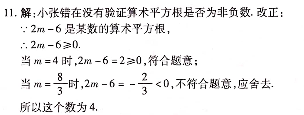 王老师给同学们布置了这样一道习题:一个数的算术平方根为 2 m − 6 2m-6 2m−6,它的平方根为 ± ( m − 2 ) ±(m-2) ±(m−2),求这个数。小张的解法如下: