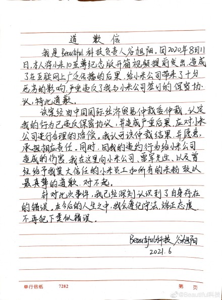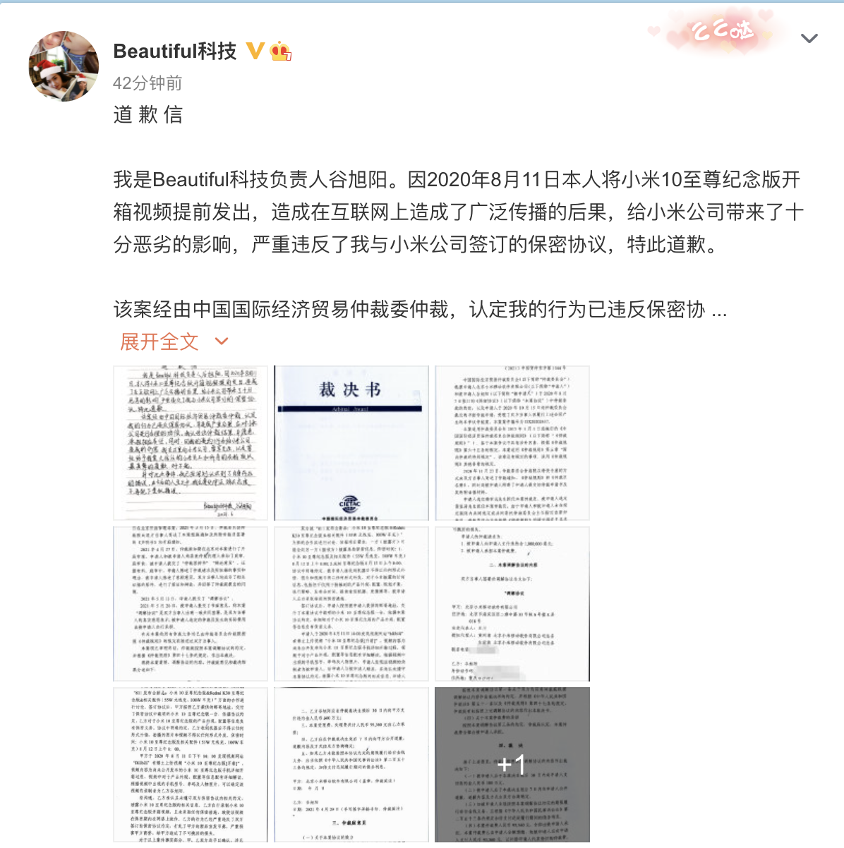 我是Beautiful科技负责人谷旭阳。因2020年8月11日本人将小米10至尊纪念版开箱视频提前发出,造成在互联网上造成了广泛传播的后果,给小米公司带来了十分恶劣的影响,严重违反了我与小米公司签订的保密协议,特此道歉。