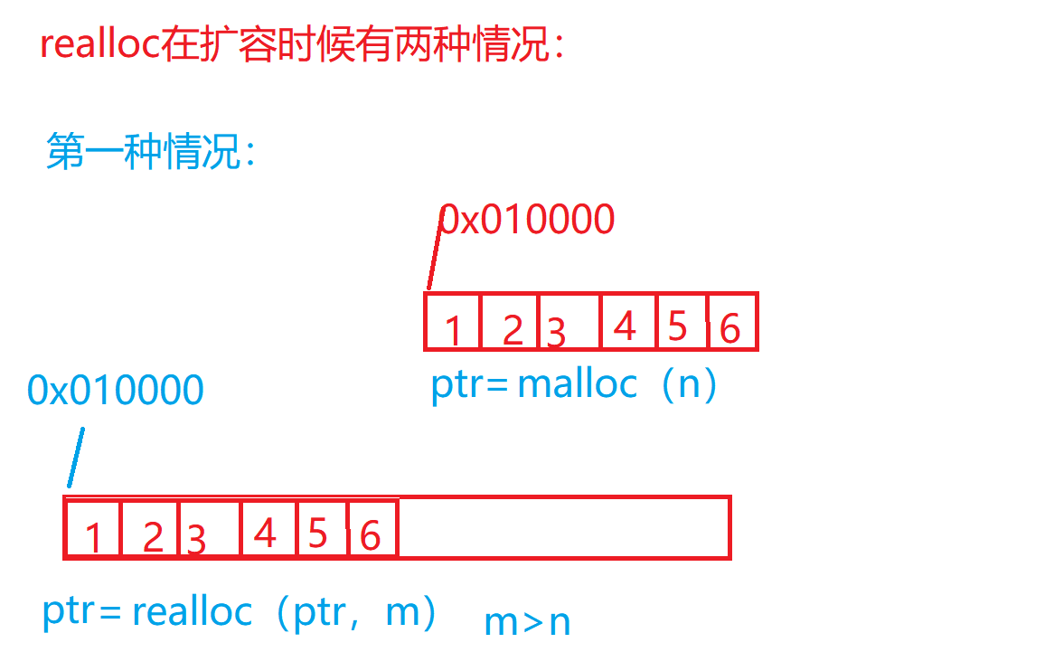 总结:1.malloc和calloc的用法一样,唯一区别就是calloc会对所申请的内存空间全部初始化为02.在使用calloc、malloc、realloc函数时候一定要判断是否开辟内存空间成功,而且当此内存空间不再使用的时候,一定要释放内存3.当p=realloc(ptr,m) 这里free是free(p)而不是free(ptr)