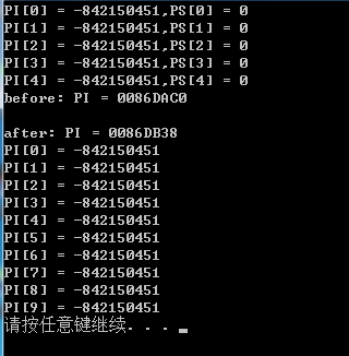 {int* PI = (int*)malloc(SIZE*sizeof(int));short* PS = (short*)calloc(SIZE, sizeof(short));for (int i = 0; i < SIZE; i++){printf("PI[%d] = %d,PS[%d] = %d\n", i, PI[i], i, PS[i]);}printf("before: PI = %p\n", PI);printf("\n");PI = (int*)realloc(PI, 2 * SIZE*sizeof(int));printf("after: PI = %p\n", PI);for (int i = 0; i < 2*SIZE; i++){printf("PI[%d] = %d\n", i, PI[i]);}free(PI);free(PS);return 0;
