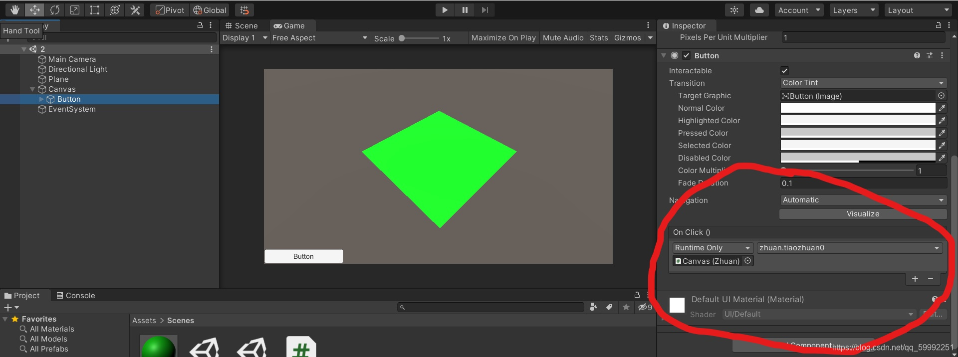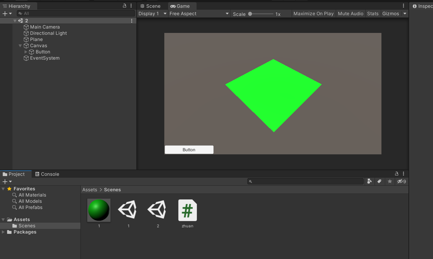 1、创建2个场景分别命名1、2。新建一个代码"zhuan"。创建一个材质球颜色调为绿色。场景"1"加入一个按钮"Button"。场景"2"加入一个平面"Plane",将绿色材质球拖拽到平面上→注:是在Scene视图下而非Gema视图下拖拽。如图: