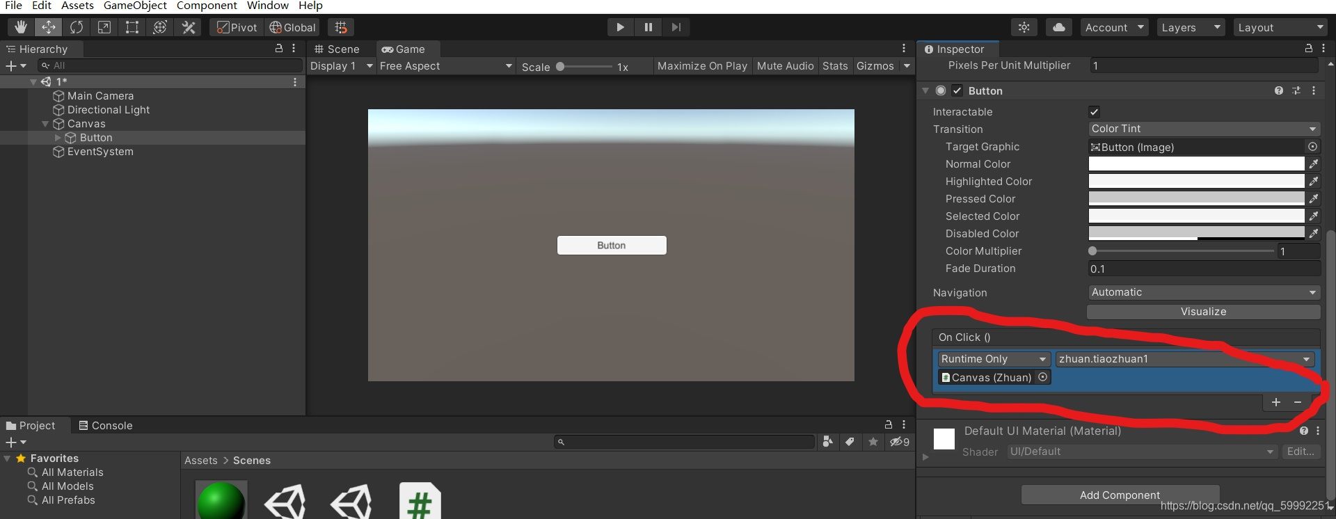 4、场景1中:在Button里On Click()新建一个触发事件,将Canvas拖拽到里面,并在其将右边选择zhuan→tiaozhuan1。如图: