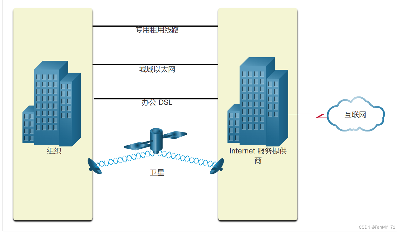 组织通常需要访问其他企业站点和互联网,支持 IP 电话、视频会议和数据中心存储等企业服务需要的快速连接。SP 提供企业级互连。最常见的企业级服务包括业务 DSL、租用线路和城域以太网。