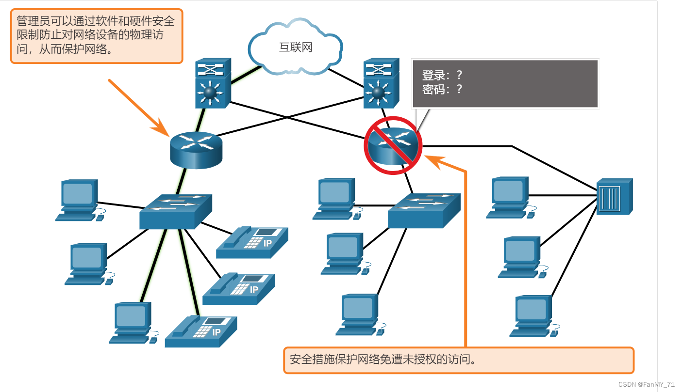 为保障网络基础设施的安全,一方面要保护提供网络连接的设备的安全,另一方面要防止有人未经授权访问网络上的管理软件,如图所示。