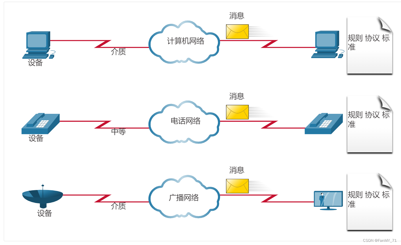 试想一座三十年前建立的学校。那时候,一些教室进行了布线,分别用于数据网络、电话网络和用来看电视的视频网络。这些独立网络无法相互通信。每个网络使用不同的技术传送通信信号。每个网络都有自己的一套规则和标准来确保成功通信。多个服务在多个网络上运行。