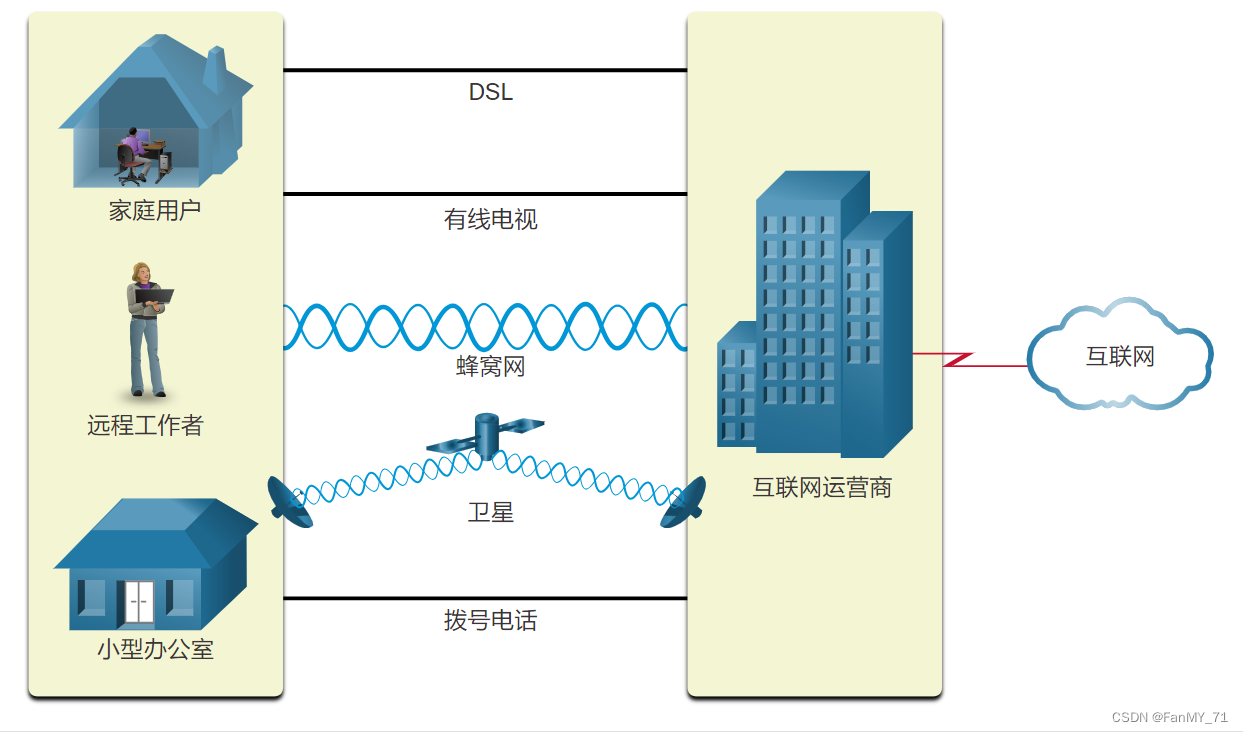 - 有线电视 - 通常由有线电视服务提供商提供,互联网数据信号在输送有线电视信号的同一电缆上进行传输。它提供了高带宽、高可用性和始终在线的互联网连接。