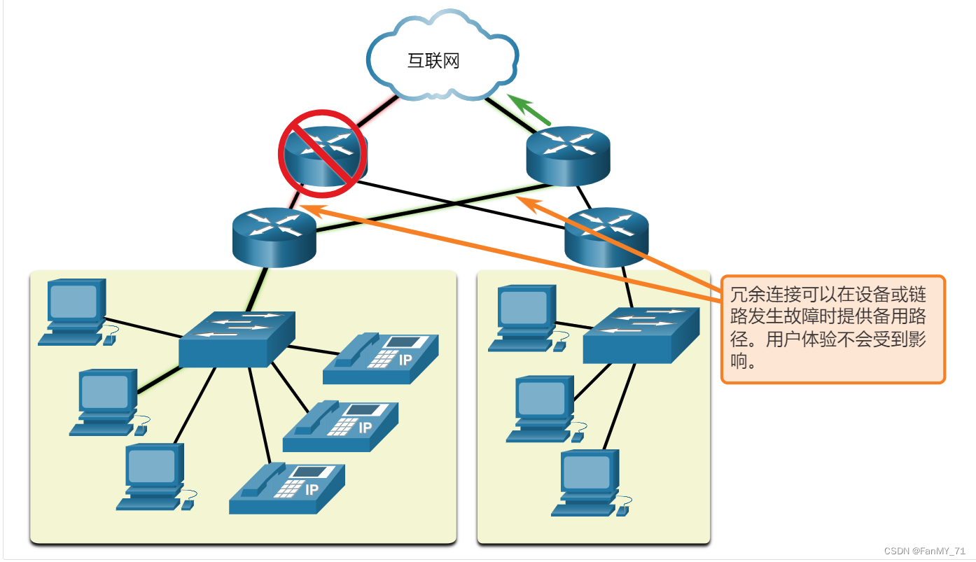 容错网络是在发生故障时限制受影响设备数量的网络。这种网络能够在发生故障时快速恢复。这些网络依赖于消息的源与目的地之间的多条路径。如果一条路径失败,消息将立即通过不同的链路发送。有多条路径到达目的地被称为冗余。