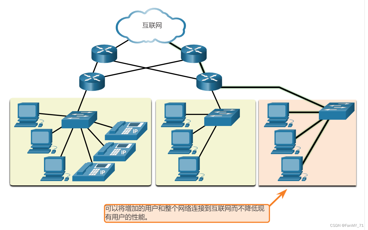 可扩展的网络可以快速扩展,以支持新用户和应用程序。它不会降低现有用户正在访问的服务的性能。图中显示了一个新网络如何轻松添加到现有网络中。网络具有扩展能力,因为设计人员可以遵循广为接受的标准和协议。这使得软件和硬件供应商可以集中精力改进产品和服务,而无需为在网络内的运行设计一套新的规则。