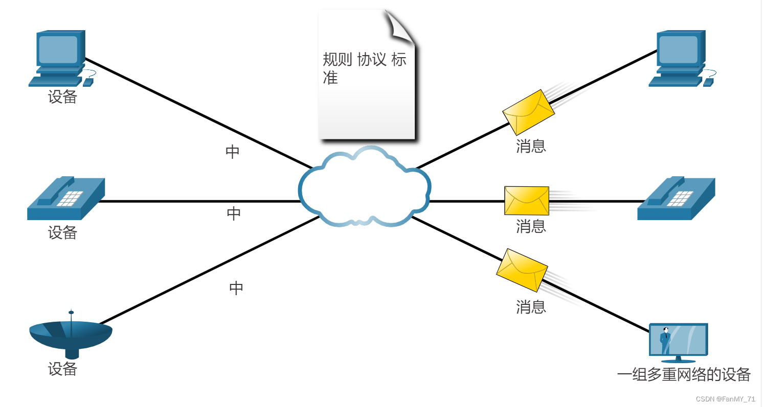 连接到网络并直接参与网络通信的所有计算机都属于主机。主机可以被称为终端设备。某些主机也称为客户端。许多计算机在网络中既是服务器又是客户端。这种网络称为对等网络。终端设备是指通过网络传输的消息的来源或目的地。中间设备将每台终端设备连接到网络,并且可以将多个独立的网络连接成网际网络。中间设备使用目的终端设备地址以及有关网络互连的信息来决定消息在网络中应该采用的路径。介质为消息从源设备传送到目的设备提供了通道。