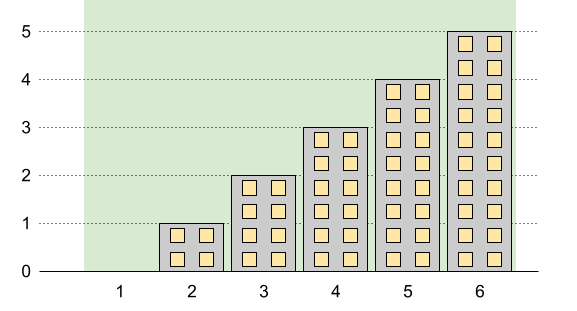 输入:n = 6, restrictions = [] 输出:5 解释:上图中的绿色区域为每栋建筑被允许的最高高度。 我们可以使建筑高度分别为 [0,1,2,3,4,5] ,最高建筑的高度为 5 。示例 3: