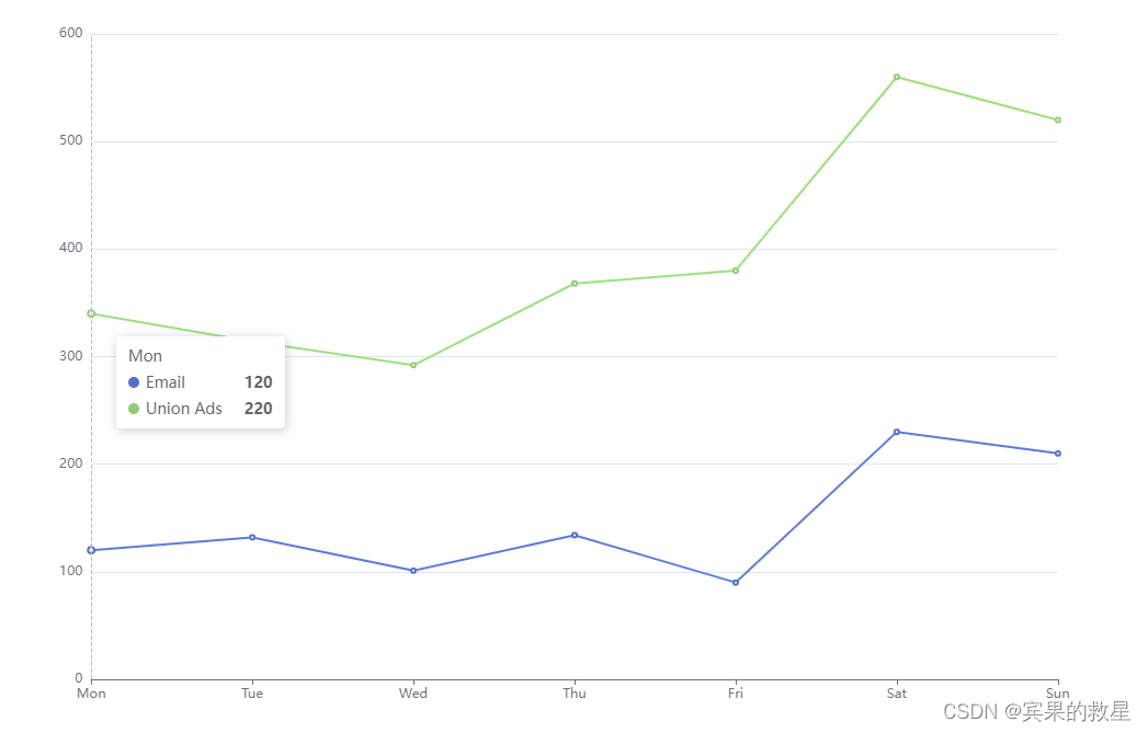 option = {tooltip: {trigger: 'axis'},xAxis: {type: 'category',boundaryGap: false,data: ['Mon', 'Tue', 'Wed', 'Thu', 'Fri', 'Sat', 'Sun']},yAxis: {type: 'value'},series: [{name: 'Email',type: 'line',data: [120, 132, 101, 134, 90, 230, 210]},{name: 'Union Ads',type: 'line',data: [220, 182, 191, 234, 290, 330, 310]},]