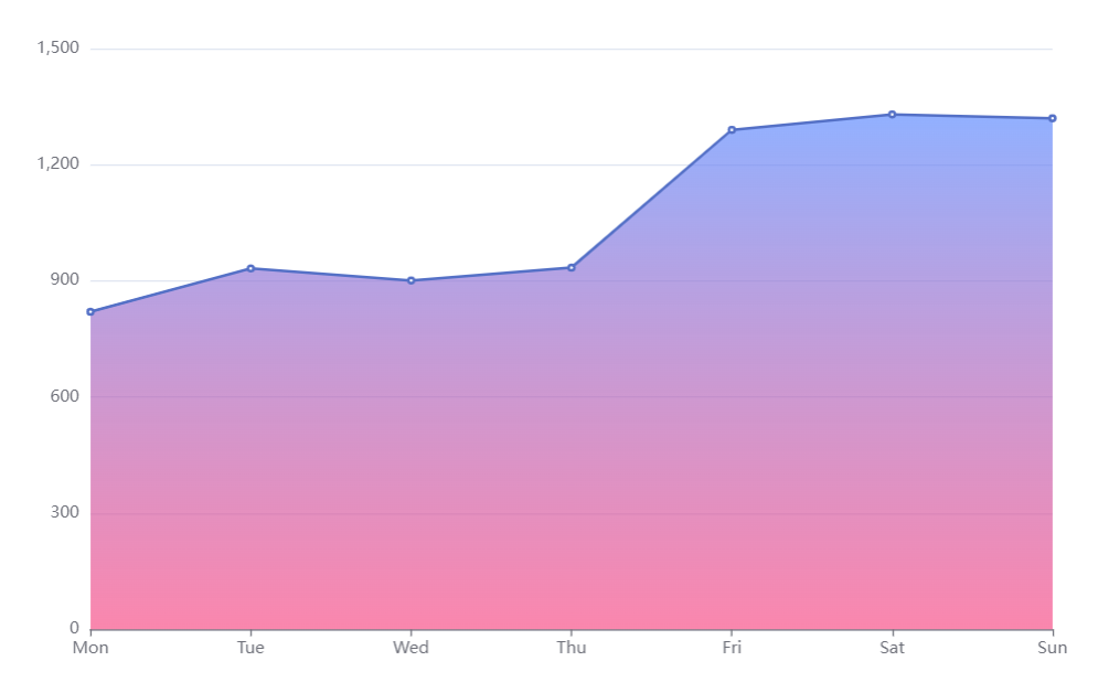 option = {xAxis: {type: 'category',boundaryGap: false,data: ['Mon', 'Tue', 'Wed', 'Thu', 'Fri', 'Sat', 'Sun']},yAxis: {type: 'value'},series: [{data: [820, 932, 901, 934, 1290, 1330, 1320],type: 'line',areaStyle: {normal: {color: {type: 'linear',x: 0,y: 0,x2: 0,y2: 1,colorStops: [{offset: 0,color: '#638FFF'},{offset: 1,color: 'rgba(248,65,126,0.90)'}],globalCoord: false}}}}]