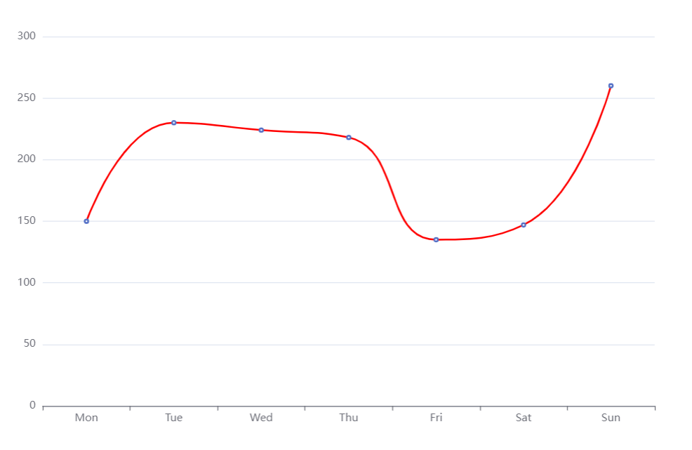option = {xAxis: {type: 'category',data: ['Mon', 'Tue', 'Wed', 'Thu', 'Fri', 'Sat', 'Sun']},yAxis: {type: 'value'},series: [{data: [150, 230, 224, 218, 135, 147, 260],type: 'line',// 折线样式lineStyle:{color:'red',},// 折线平滑smooth: true}]