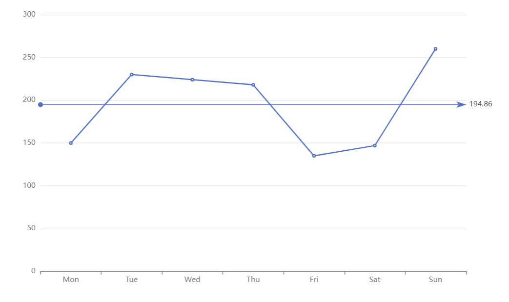 option = {xAxis: {type: 'category',data: ['Mon', 'Tue', 'Wed', 'Thu', 'Fri', 'Sat', 'Sun']},yAxis: {type: 'value'},series: [{markLine: {data: [{type: 'average',name: '平均值'}],lineStyle: {type: 'solid'}},data: [150, 230, 224, 218, 135, 147, 260],type: 'line'}]