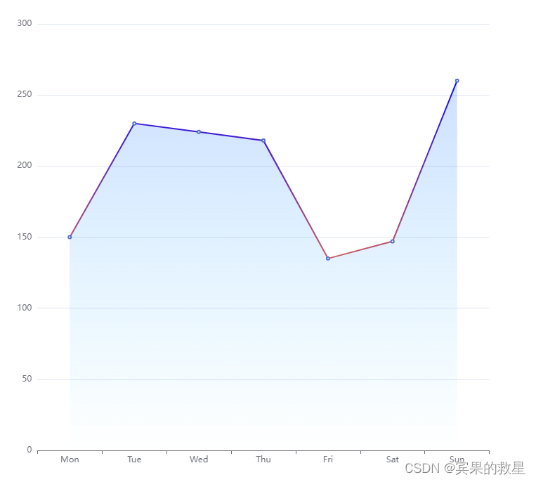 option = {xAxis: {type: 'category',data: ['Mon', 'Tue', 'Wed', 'Thu', 'Fri', 'Sat', 'Sun']},yAxis: {type: 'value'},series: [{data: [150, 230, 224, 218, 135, 147, 260],type: 'line',//线条样式itemStyle: {color: '#6A5ACD', normal: { lineStyle: { width: 2, type: 'solid', color: new echarts.graphic.LinearGradient(0, 0, 0, 1, [{ offset: 0, color: '#0000FF' }, { offset: 1, color: '#CD5C5C' }]),} }, emphasis: {color: '#6A5ACD', lineStyle: { width: 2, type: 'dotted', color: new echarts.graphic.LinearGradient(0, 0, 0, 1, [{ offset: 0, color: '#1E90FF' }, { offset: 1, color: '#0000FF' }]) } } },//区域颜色渐变areaStyle:{normal:{//颜色渐数 四个参数表示四个位置左、下、右、上color: new echarts.graphic.LinearGradient(0, 0, 0, 1, [{offset: 0,color: 'rgba(80,141,255,0.39)'}, {offset: .34,color: 'rgba(56,155,255,0.25)'},{offset: 1,color: 'rgba(38,197,254,0.00)'}])}},}]