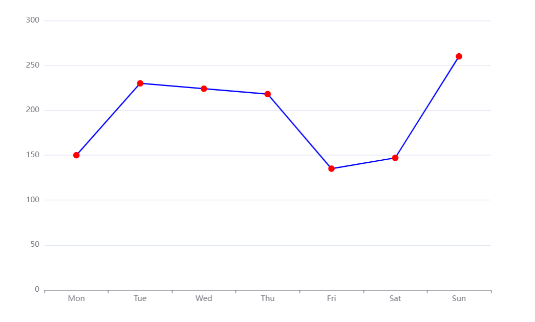option = {xAxis: {type: 'category',data: ['Mon', 'Tue', 'Wed', 'Thu', 'Fri', 'Sat', 'Sun']},yAxis: {type: 'value'},series: [{data: [150, 230, 224, 218, 135, 147, 260],type: 'line',// 折线lineStyle:{color: 'blue'},// 折线点itemStyle:{color: 'red',},symbol:'circle',symbolSize:[10,10]}]