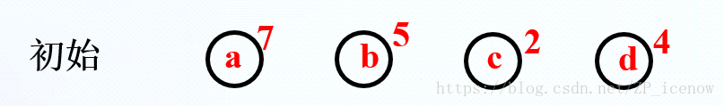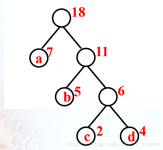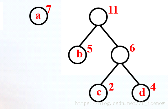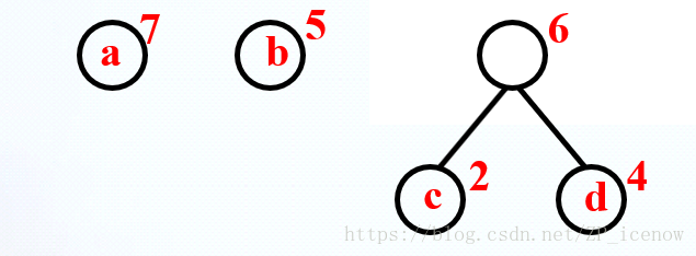 4 个叶子结点 a、b、c、d,分别带权7、5、2、4。构造流程画图说明一下: