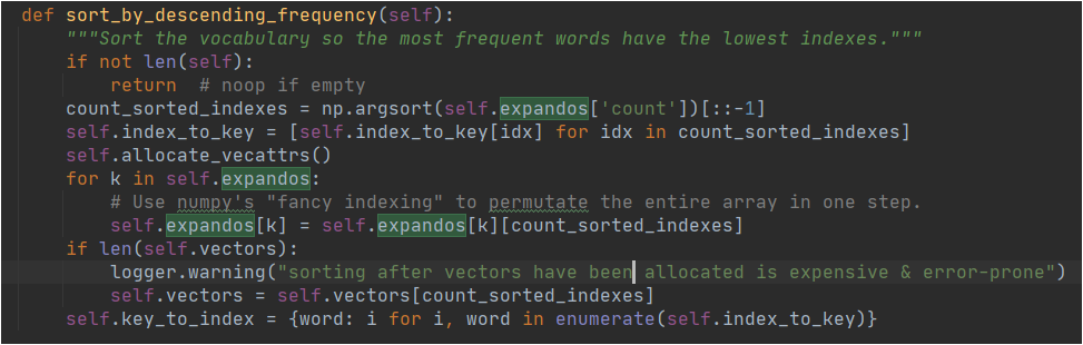 还有一个问题:词频的获取,版本更新之后输出的词向量已经去重,没办法在key_to_index里面去计数,再去研究库源代码,发现了计数值/频率在新版本只用来对词向量排序(按出现频率最大降序排列),储存在self.expandos['count']这个np数组中,那词向量的词频就直接白嫖就好了。