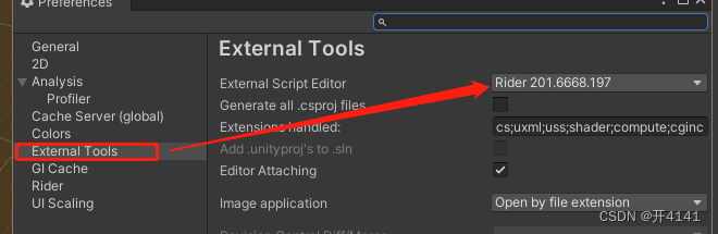 现在要设置一下Unity和Rider的关联,在Unity左上方的工具栏中Edit-Preferences中选择Rider