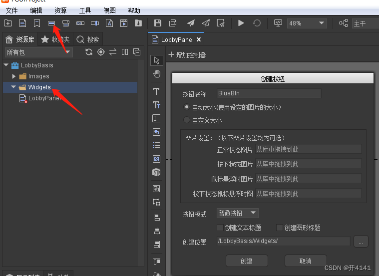 在Widgets文件下点击头部栏第四个按钮(如图),创建一个按钮,参数如下,点击创建