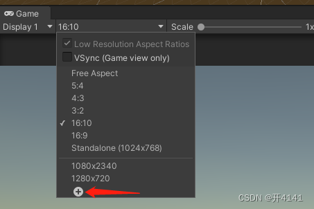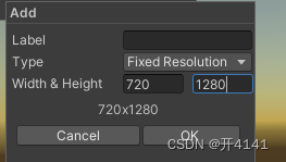 如图,选择一下Unity的窗口尺寸,点击+号,然后新增一个720*1280的(与我们的UI尺寸一致),并选中