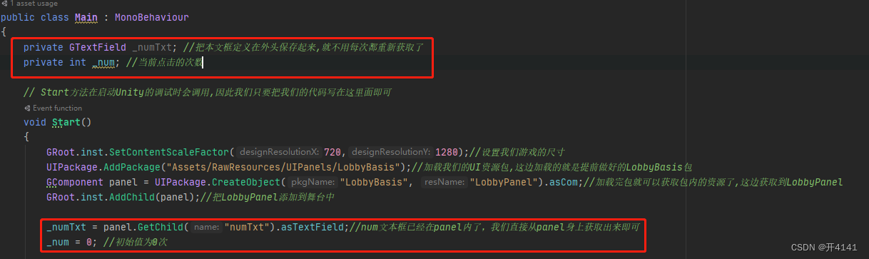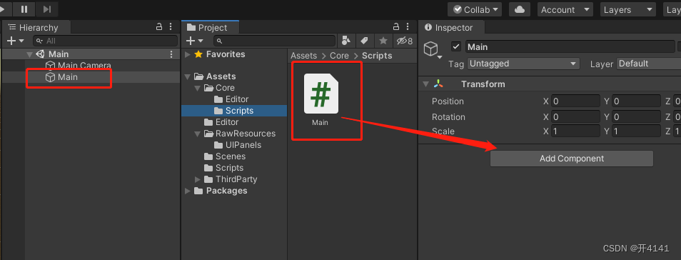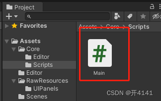右键红框区域-Create-C# Script创建第一个C#脚本:Main.cs 【这将会是游戏后续的代码逻辑入口】