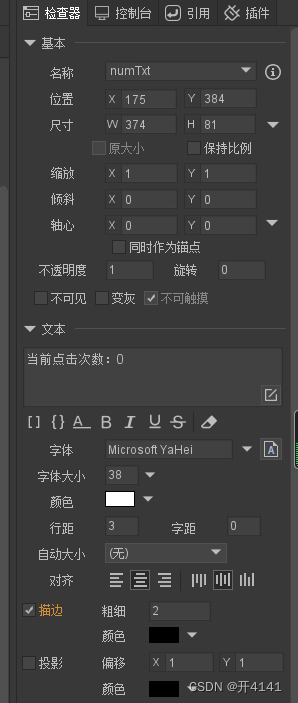 将lobby_bg拖入LobbyPanel中,并点击侧片栏制作一个文本控件,命名与参数如图
