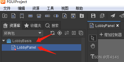 2、制作游戏大厅面板的UI,打开FGUI将新项目默认带有的两个东西改名(如图)