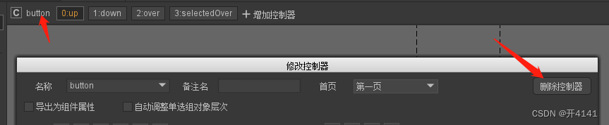 双击进入刚才创建的按钮,点击button(如图),然后点击删除控制器(控制器是FariyGUI很重要的一个功能,后面再说,暂时不需要)