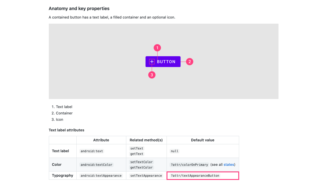 MDC 开发者文档已于最近更新。在本次更新中,我们加入了属性表,涵盖了开发库中所使用的设计术语和属性默认值。例如下面是更新的 按钮文档 的 “Anatomy and key properties” (详解和关键属性) 部分。