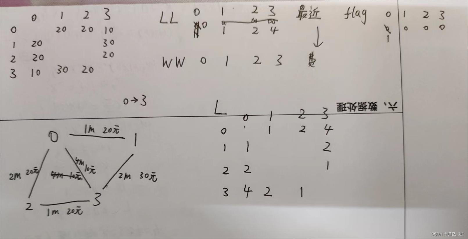 {memset(flag, 0, sizeof(flag));//flag清零memset(LL, max, sizeof(LL));//LL清零LL[s] = 0;int k = n;while (k--){int x, min = max;for (int i = 0; i < n; i++){if (flag[i] == 0 && LL[i] < min)//flag==0确保每个点都会作为起始点来一遍{x = i;min = LL[i];}}flag[x] = 1; //标志这个点已经当过起始点for (int j = 0; j < n; j++)if (L[x][j] != 0&&flag[j]==0)//寻找与当前点相连的点且排除前面选过的点{int xinju = L[x][j] + LL[x];//新距离int xinfei = F[x][j] + FF[x];//新费用if (xinju < LL[j])//距离最短优先{LL[j] = xinju;FF[j] = xinfei;}else if (xinju == LL[j]){if (xinfei < FF[j]){FF[j] = xinfei;}}}}