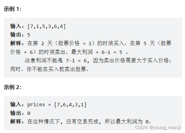 class Solution {public int maxProfit(int[] prices) {//所以这里就相当于已经有了一些数据,然后我们只需要在数据中找到差值最大的两个数据的下标就可以,前提就是不可以用前面减去后面而已if(prices.length==0) return 0; //如果不存在,直接返回0int x=0; //指向最前面int y=prices.length-1; //指向最后面int result=0; //定义一个用来装载我们的结果return helper(prices,0,y,result);}private int helper(int[] prices,int x,int y,int result){if(y==0) return result;for(int i=x;iprices[y]){continue;}result=Math.max(prices[y]-prices[i],result);}result=Math.max(helper(prices,0,y-1,result),result);return result;}