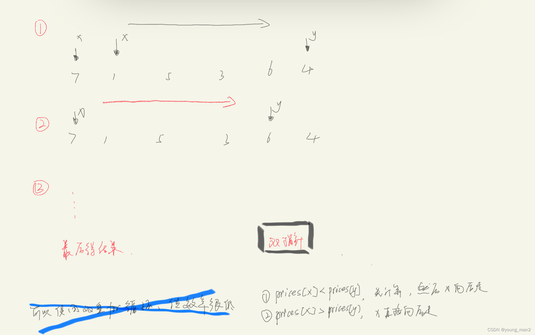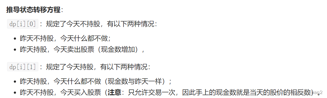 public class Solution {public int maxProfit(int[] prices) {int len = prices.length;// 特殊判断if (len < 2) {return 0;}int[][] dp = new int[len][2];// dp[i][0] 下标为 i 这天结束的时候,不持股,手上拥有的现金数// dp[i][1] 下标为 i 这天结束的时候,持股,手上拥有的现金数// 初始化:不持股显然为 0,持股就需要减去第 1 天(下标为 0)的股价dp[0][0] = 0;dp[0][1] = -prices[0];// 从第 2 天开始遍历for (int i = 1; i < len; i++) {dp[i][0] = Math.max(dp[i - 1][0], dp[i - 1][1] + prices[i]);dp[i][1] = Math.max(dp[i - 1][1], -prices[i]);}return dp[len - 1][0];}