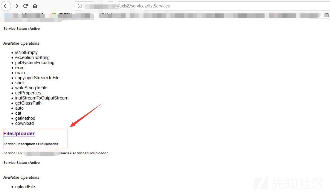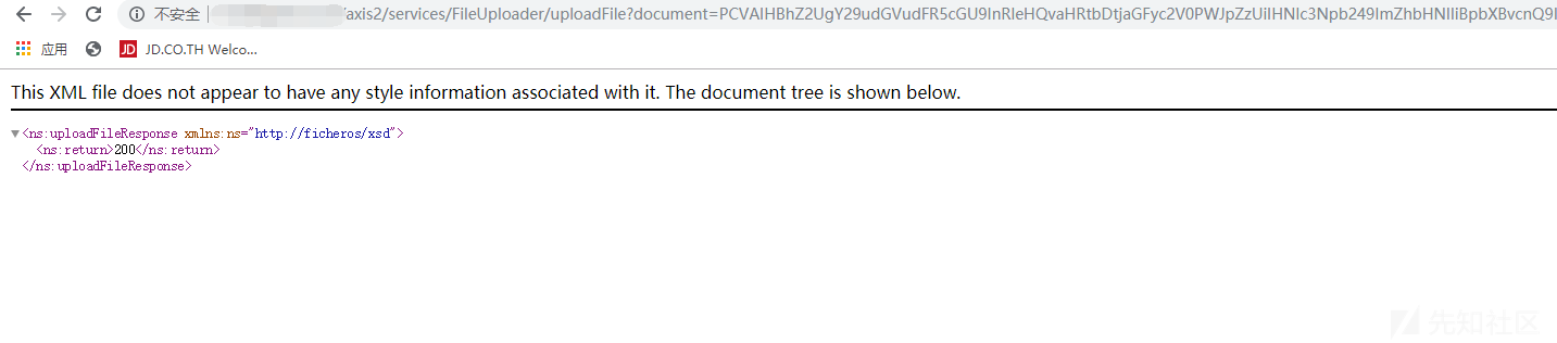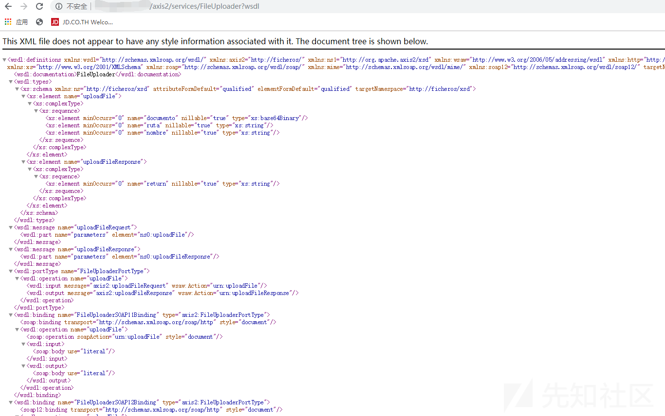 访问http://xxxxxx/axis2/services/FileUploader?wsdl 发现一个wsdl接口文档,名为uploadfile