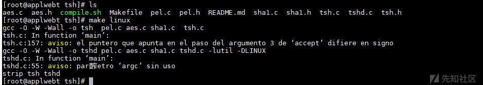解压后进入tsh目录,然后执行编译(原本打算在自己服务器上编译后上传,结果因为库版本不同报错)