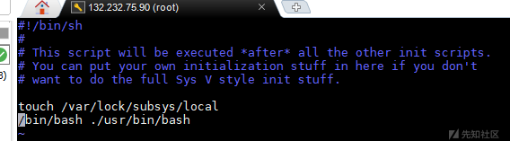 如果,目标机器重启,则tsh后门将要失效,为了防止tsh失效,我们可以在/etc/rc.local文件中写入
