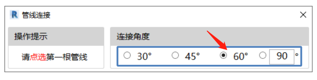 2、管线连接窗口提示:“请选择第一根管线”,连接角度“30,45,60,自定义”