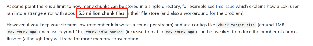 Chunks是Loki长期数据存储,旨在提供查询和写入操作,支持DynamoDB、Bigtable、 Cassandra、S3、FS(单机)。index是根据chunks中元数据生成的索引,支持DynamoDB、Bigtable、 Apache Cassandra、BoltDB(单机)。默认情况下Chunks使用FS本地文件系统存储,文件系统存储存在一定的限制,大约可以存储550W个chunk,超过这个限制可能会有问题。