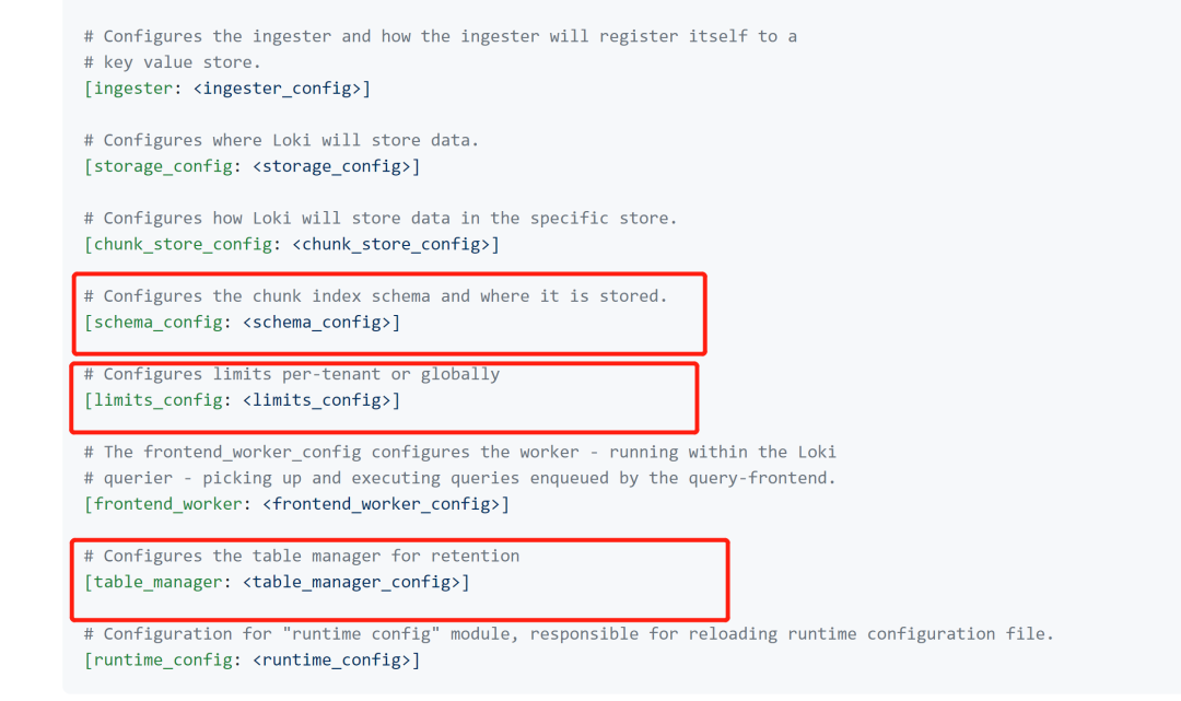 Loki的配置比较多,配置在/etc/loki/loki.yaml中,如果需要优化存储或者日志接收出现异常问题时可能需要修改配置。比如Loki在接收客户端发送日志可能会出现发送速率超过限制,这个时候可能需要修改ingestion_rate_mb。具体可以参考: