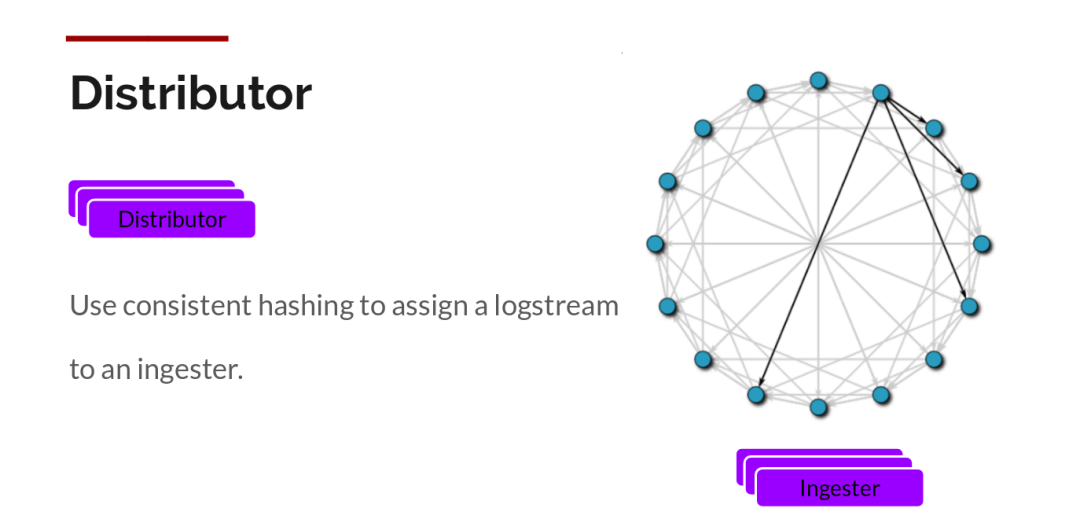 它的主要功能是接收来自客户端的日志,Distributor接收到日志之后,首先会校验正确性,校验通过之后会把它划分为多个批次,并发送给Ingester。每个发送过来的流都对应一个Ingester,当日志发送到Distributor之后,Distributor会根据hash和元数据算法计算应该路由到那个Ingester上。